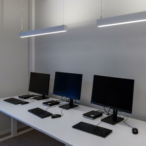 Nedhengt kontorarmatur med opp- og nedlys (70/30) og lav blending, UGR<19 som egner seg godt over arbeidsplassen eller møtebord. Ved å holde snoren nede vil lyset dimmes.