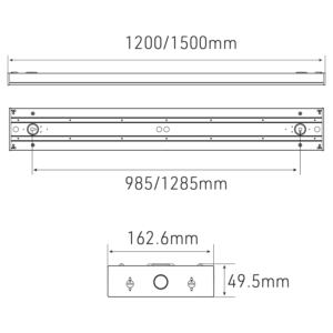 Varianter: Tilgjengelig i lengdene 120cm og 150cm. Bredde: 16,2cm. Høyde 49,5mm. En versjon med DALI (150cm) er også tilgjengelig for de som søker mer avanserte lysstyringssystemer.