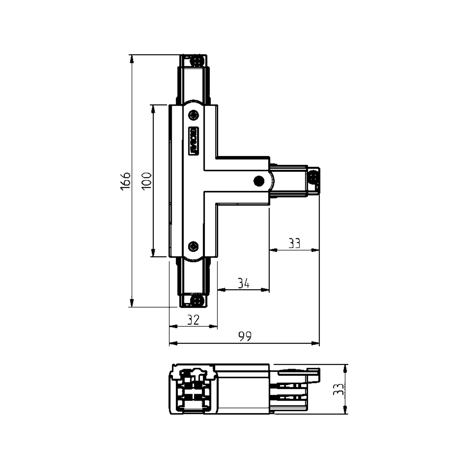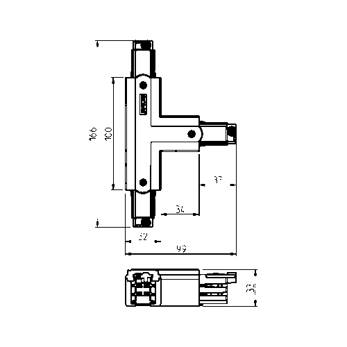 T-kobling venstre (innvendig) for å koble Global Pro 3-fase skinner sammen.